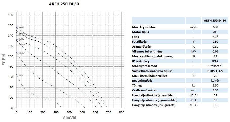 Vízszintes kifúvású, AC-motorral felszerelt tetőventilátor szellőző-, és légkondicionáló rendszerekben való használatra, 250 mm átmérőjű járókerékkel, AlMg3 házzal, 230V/1f elektromos betáplálással, IP54-es motor védelmi osztállyal, integrált motorvédelemmel, hátrahajló lapátozású lapátkerékkel, kültéri telepítésre. -23°C és +40°C közötti külső léghőmérséklethez és maximum 70°C üzemi hőmérséklethez. Kizárólag tiszta és szennyeződésmentes levegő elszívására.