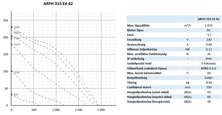 Vízszintes kifúvású, AC-motorral felszerelt tetőventilátor szellőző-, és légkondicionáló rendszerekben való használatra, 315 mm átmérőjű járókerékkel, AlMg3 házzal, 230V/1f elektromos betáplálással, IP54-es motor védelmi osztállyal, integrált motorvédelemmel, hátrahajló lapátozású lapátkerékkel, kültéri telepítésre. -23°C és +40°C közötti külső léghőmérséklethez és maximum 60°C üzemi hőmérséklethez. Kizárólag tiszta és szennyeződésmentes levegő elszívására.