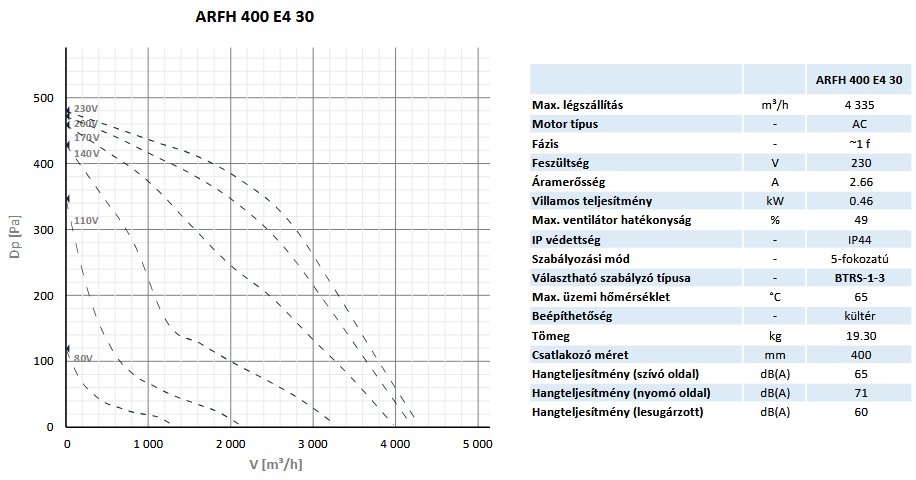 Vízszintes kifúvású, AC-motorral felszerelt tetőventilátor szellőző-, és légkondicionáló rendszerekben való használatra, 400 mm átmérőjű járókerékkel, AlMg3 házzal, 230V/1f elektromos betáplálással, IP54-es motor védelmi osztállyal, integrált motorvédelemmel, hátrahajló lapátozású lapátkerékkel, kültéri telepítésre. -23°C és +40°C közötti külső léghőmérséklethez és maximum 65°C üzemi hőmérséklethez. Kizárólag tiszta és szennyeződésmentes levegő elszívására.
