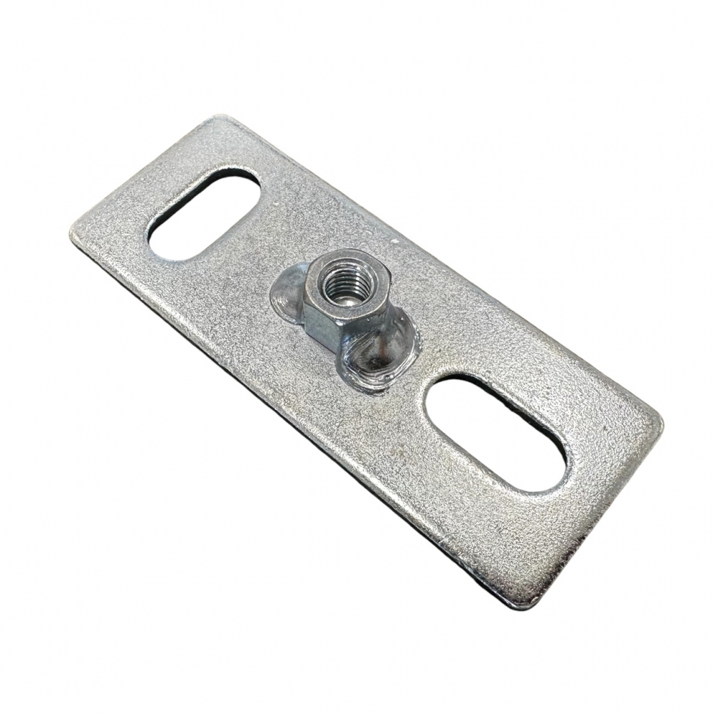 Mérete: 100 x 40 x 2 mm, a hegesztett kötéssel az alapra merőlegesen rögzített M8 menetes anyacsavar 10 mm-es hosszúságú. Anyaga: horganyzott acél. 2 db tőcsavarral oldalfalra vagy mennyezetre rögzíthető, M8-as menetes szár fogadására alkalmas. Kiszerelés: 10 db/doboz.