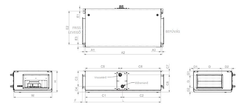 Beltérben, mennyezet alá elhelyezhető szigetelt házas, EC motoros mini befúvó légkezelő, táskás szűrővel, elektromos fűtőelemmel, 30 mm vastag hő- és hangszigetelt házzal, gyárilag beépített motoros fagyvédelmi zsaluval, szűrőeltömődés kapcsolóval, illetve változtatható szervizelési oldallal. Névleges légszállítás: 1000 m3/h. Elektromos fűtőelem teljesítménye: 2,4 kW. Motor kivitelére utaló jelzés: L1.
