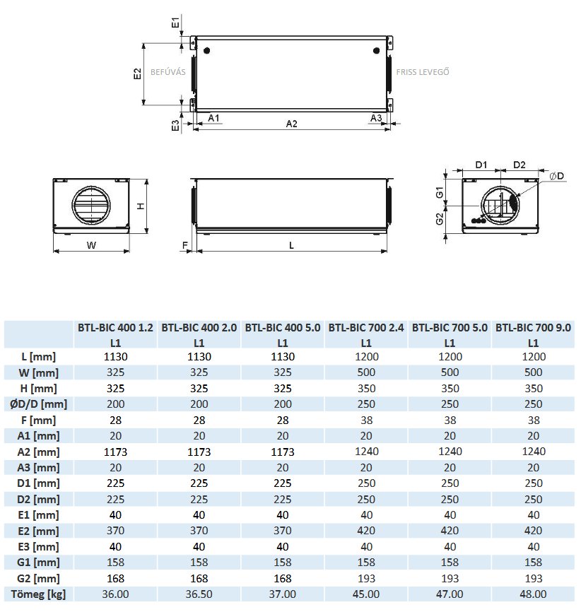 Beltérben, mennyezet alá elhelyezhető szigetelt házas, EC motoros mini befúvó légkezelő, táskás szűrővel, elektromos fűtőelemmel, 30 mm vastag hő- és hangszigetelt házzal, gyárilag beépített motoros fagyvédelmi zsaluval, szűrőeltömődés kapcsolóval, illetve változtatható szervizelési oldallal. Névleges légszállítás: 700 m3/h. Elektromos fűtőelem teljesítménye: 5 kW. Motor kivitelére utaló jelzés: L1.