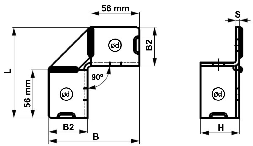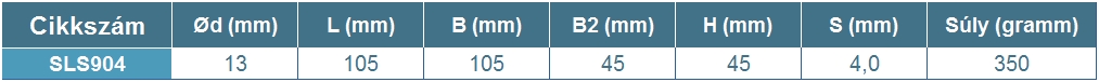 Alapanyaga: galvanikusan horganyzott acél. Mérete: 105 x 105 mm x 45 mm, anyagvastagsága 4 mm, 2 x 2 db Ø13 mm-es furattal, 90°-os csatlakozást lehetővé tevő kialakítással. A 41/21-es és 41/41-es C-sínek (szerelősínek) 90 fokos szögben történő összekapcsolására használatos kötőelem (12-es alátéttel ellátott csavar; kalapácsfejű csavar; stb.).