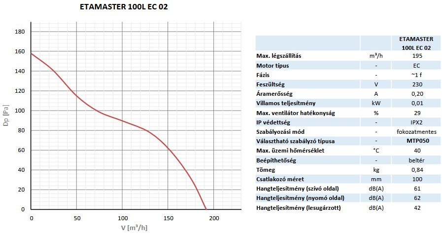 ETAMASTER EC fokozatmentes félradiális csőventilátor EC motorral ; Erősített kivitelű (L-es) NA100 mm ; Két cső közé építhető, kompakt kialakítása és a súlycsökkentés hozzájárul a könnyű telepíthetőséghez ; A ház korrózió és időjárásálló bazaltszürke színű (RAL7012) ; A motor beépített hővédelemmel rendelkezik ; fokozatmentes meghajtómotor (230V~, 50Hz, 1f) ; Védelmi osztály (IPX4) ; "F" szigetelési osztály ;
