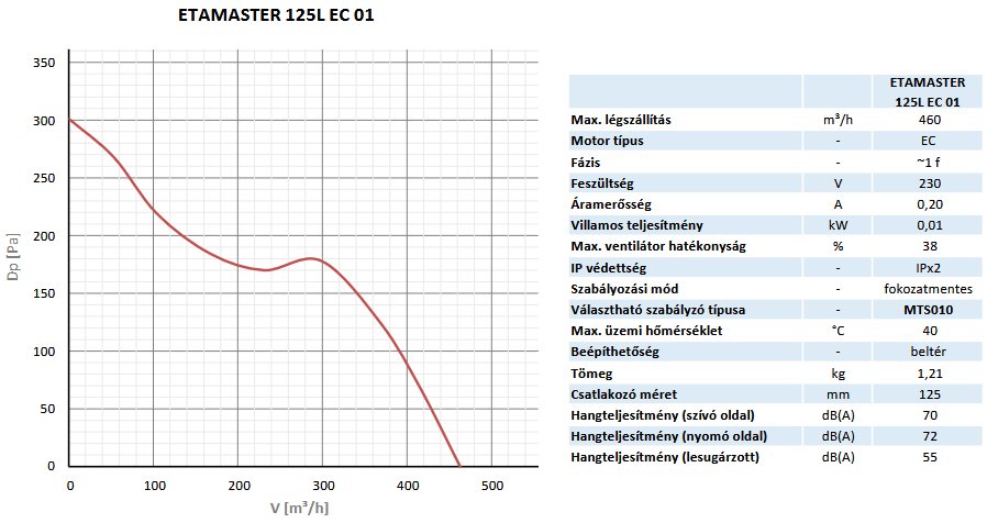 ETAMASTER EC 3-fokozatú félradiális csőventilátor EC motorral ; Erősített kivitelű (L-es) NA125 mm ; Két cső közé építhető, kompakt kialakítása és a súlycsökkentés hozzájárul a könnyű telepíthetőséghez ; A ház korrózió és időjárásálló bazaltszürke színű (RAL7012) ; A motor beépített hővédelemmel rendelkezik ; 3 sebességfokozatú meghajtómotor (230V~, 50Hz, 1f) ; Védelmi osztály (IPX4) ; "F" szigetelési osztály ;
