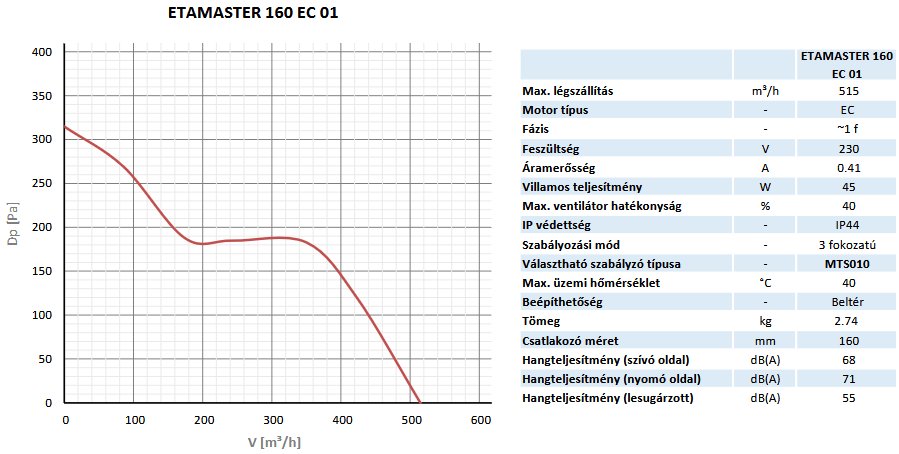 ETAMASTER EC 3-fokozatú félradiális csőventilátor EC motorral ; NA160 mm ; Két cső közé építhető, kompakt kialakítása és a súlycsökkentés hozzájárul a könnyű telepíthetőséghez ; A ház korrózió és időjárásálló bazaltszürke színű (RAL7012) ; A motor beépített hővédelemmel rendelkezik ; 3 sebességfokozatú meghajtómotor (230V~, 50Hz, 1f) ; Védelmi osztály (IPX4) ; "F" szigetelési osztály ;