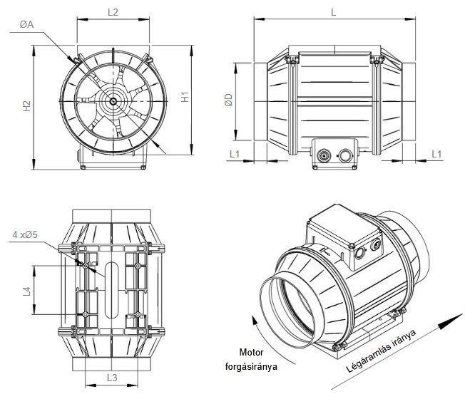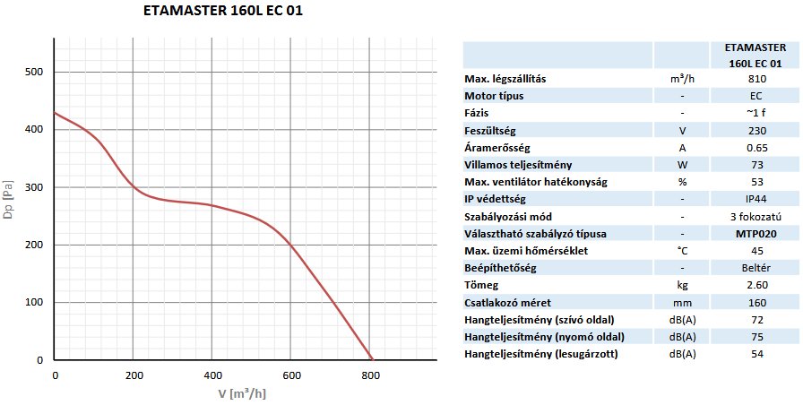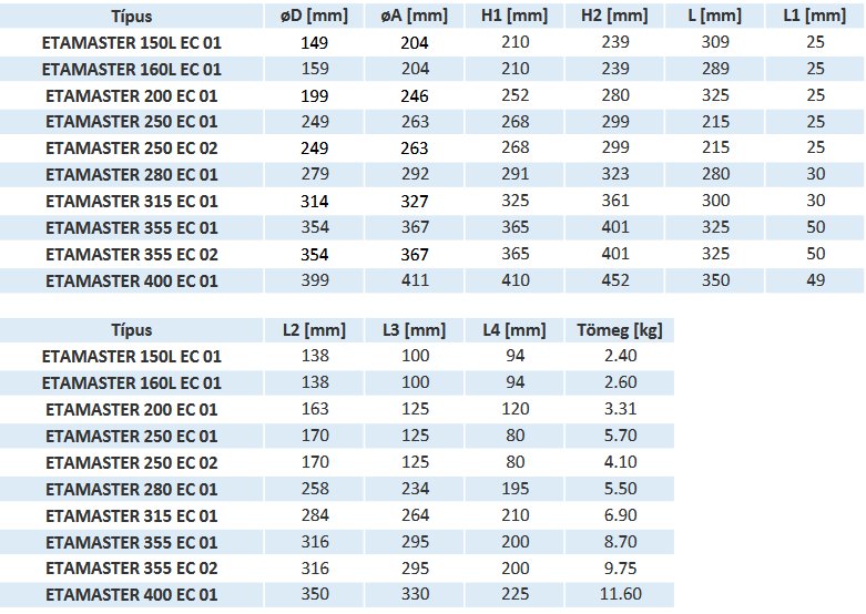 ETAMASTER EC 3-fokozatú félradiális csőventilátor EC motorral ; Erősített kivitelű (L-es) NA160 mm ; Két cső közé építhető, kompakt kialakítása és a súlycsökkentés hozzájárul a könnyű telepíthetőséghez ; A ház korrózió és időjárásálló bazaltszürke színű (RAL7012) ; A motor beépített hővédelemmel rendelkezik ; 3 sebességfokozatú meghajtómotor (230V~, 50Hz, 1f) ; Védelmi osztály (IPX4) ; "F" szigetelési osztály ;