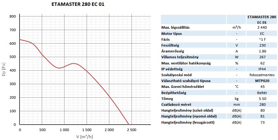 ETAMASTER EC 3-fokozatú félradiális csőventilátor EC motorral ; NA280 mm ; Két cső közé építhető, kompakt kialakítása és a súlycsökkentés hozzájárul a könnyű telepíthetőséghez ; A ház korrózió és időjárásálló bazaltszürke színű (RAL7012) ; A motor beépített hővédelemmel rendelkezik ; 3 sebességfokozatú meghajtómotor (230V~, 50Hz, 1f) ; Védelmi osztály (IPX4) ; "F" szigetelési osztály ;