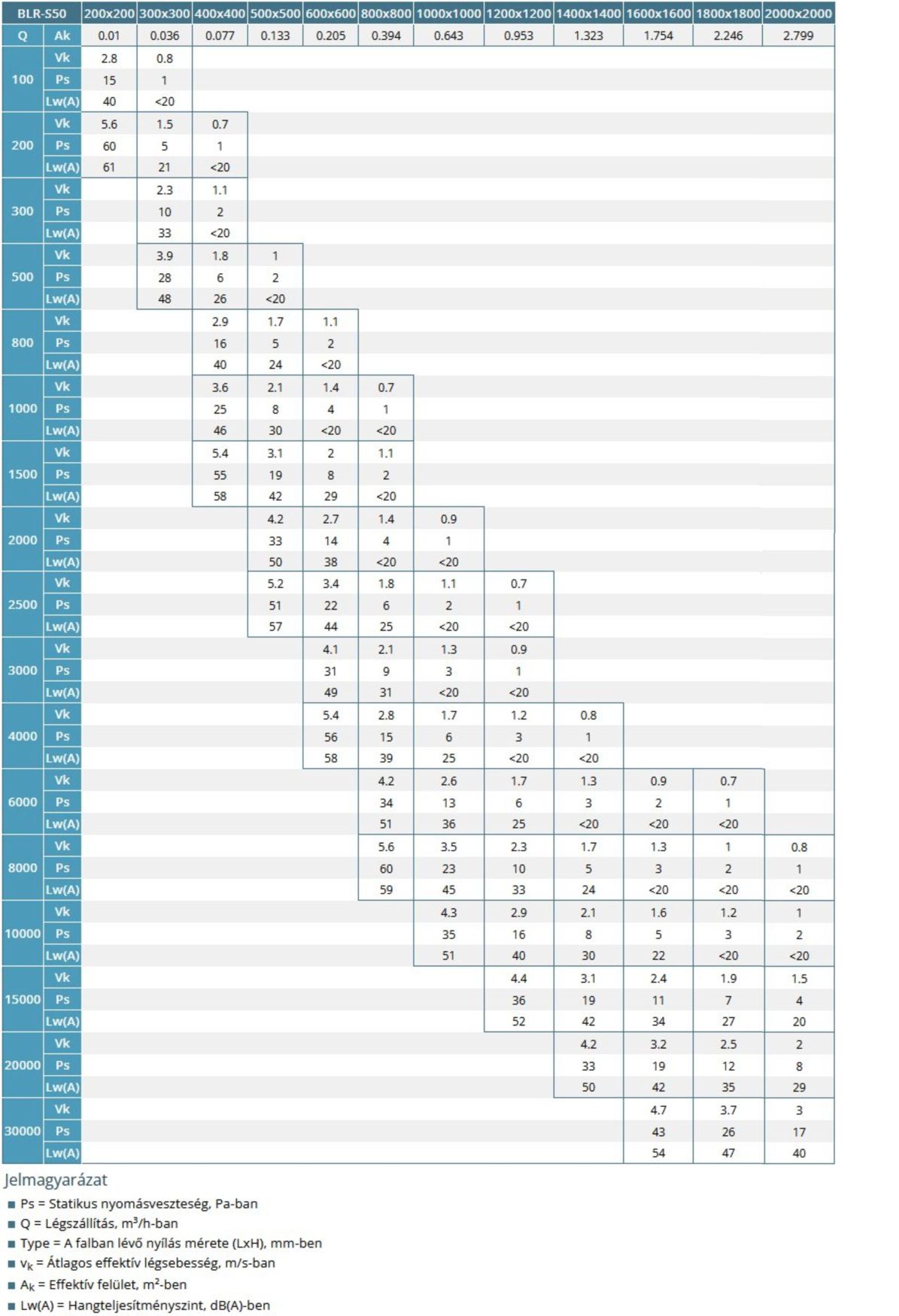 BLR-S50 = Rács típusa 400 = Névleges csatlakozási szélesség, mm-ben 200 = Névleges csatlakozási magasság, mm-ben