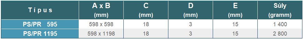 PS/PR 595 négyzethálós mennyezeti rács (tényleges méret: 598 x 598 mm); Maximális légáteresztés: 3000 m³/h; Fehér színű poliészterből készül, 80%-os szabad keresztmetszettel; Átszellőző elszívórács 14.3x14.3 mm-es négyzethálóval; 600x600 mm és 1200x600 mm álmennyezeti raszterbe, a tartóbordákra illeszkedő rács; Levegő elszívásra alkalmas, szellőző és légkondicionáló rendszerekben;